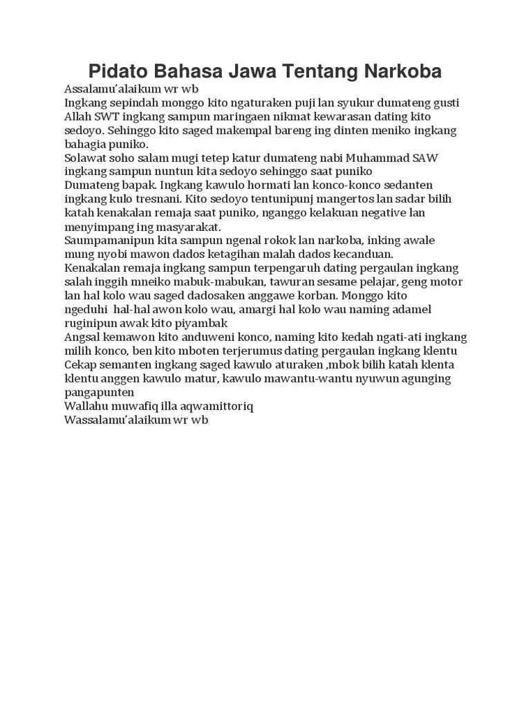 Video kali ini menampilkan contoh pidato bahasa jawa tentang bahaya narkoba dan rokok yang disampaikan oleh siswi sma negeri 2 karanganyar, . Pidato bahasa jawa tentang narkoba. Ingkang sepindah monggo kito ngaturaken puji lan syukur dumateng gusti Contoh pidato bahasa jawa tentang pendidikan assalamu'alaikum wr. Contoh pidato singkat bahasa indonesia kumpulan naskah contoh teks pidato singkat tentang pendidikan perpisahan di sekolah dan kampus pidato narkoba pergaulan .